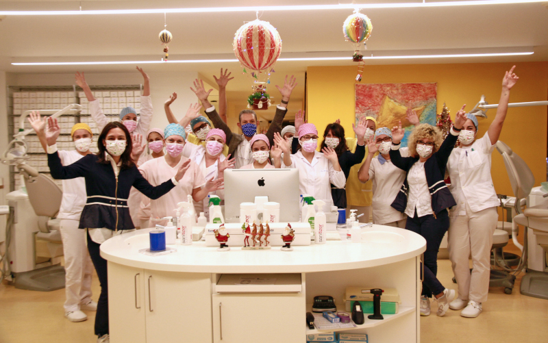 El espíritu navideño está en todas partes y ha invadido la clínica llenándola de colores y de ilusión; durante varios días nuestro equipo ha estado decorando cada rincón con muchísimo mimo. Nuestro árbol de Navidad alberga este mes al Sr. Ratón Pérez y a la Srta. Tooth Fairy, quienes pasan el tiempo presumiendo de la recolección de dientes de leche de este año. Mientras, Papá Noel, ha dejado aparcado su trineo mágico y practica en sus ratos libres “salto en paracaídas” en nuestro jardín.